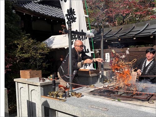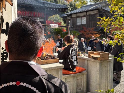 その後、護摩壇の前で数珠のお焚き上げへ。